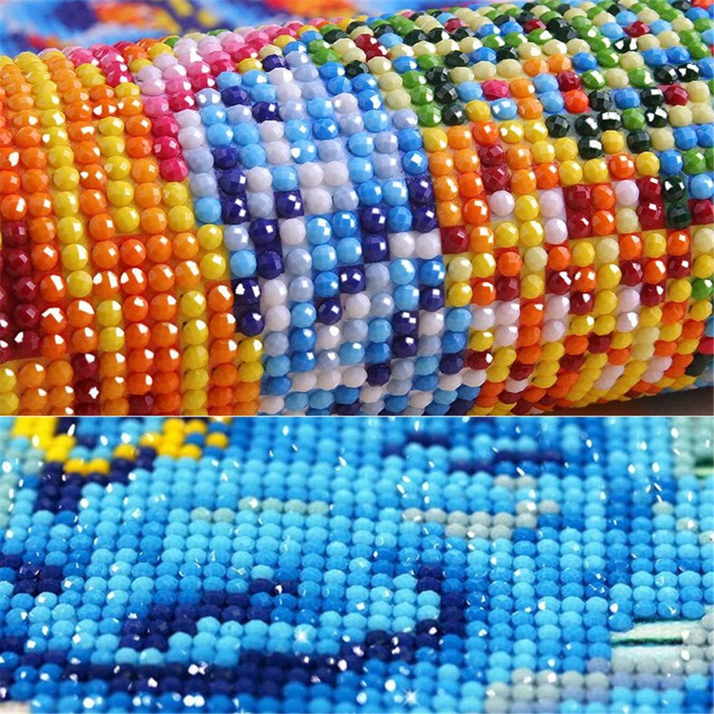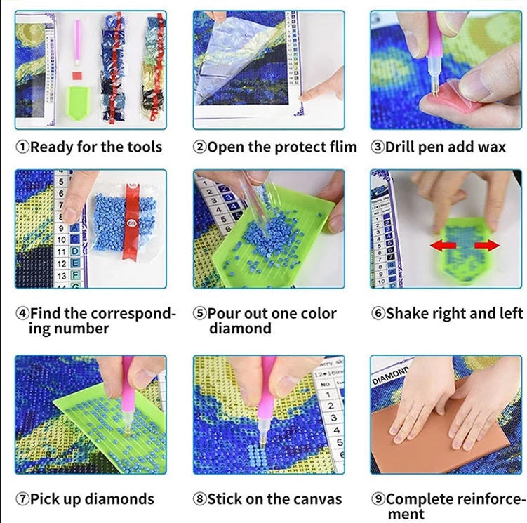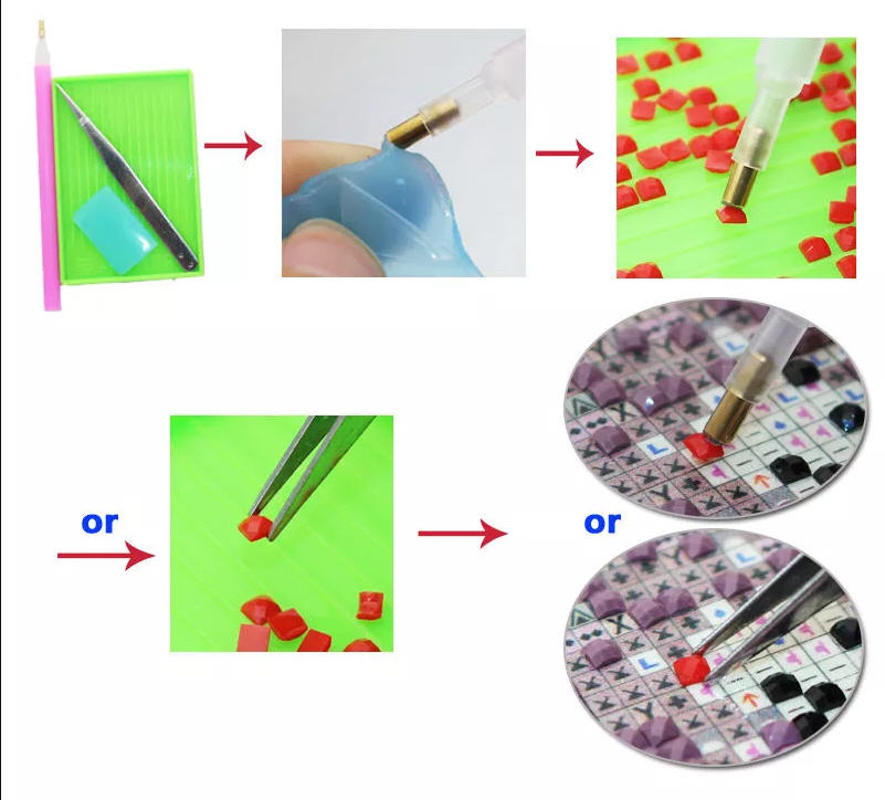 Man påsætter de nummererede farvede rhinsten på tilsvarende nummererede felter og vupti så har man et fint billede.
